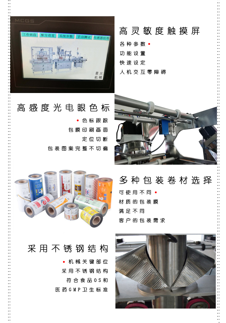 1、胡椒醬包裝機(jī)整機(jī)由進(jìn)口可編程序控制器,伺服電機(jī)超大顯示觸摸屏構(gòu)成驅(qū)動控制核心,性能穩(wěn)定、操作簡單;